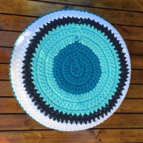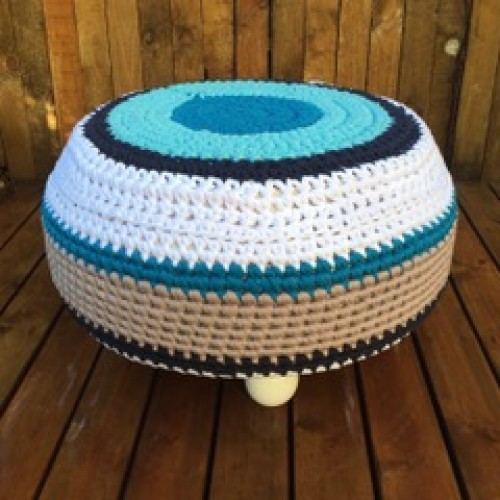 This Tyre ottoman, has a soft foam top, and is covered in a crochet cotton waste. with a nautical theme.