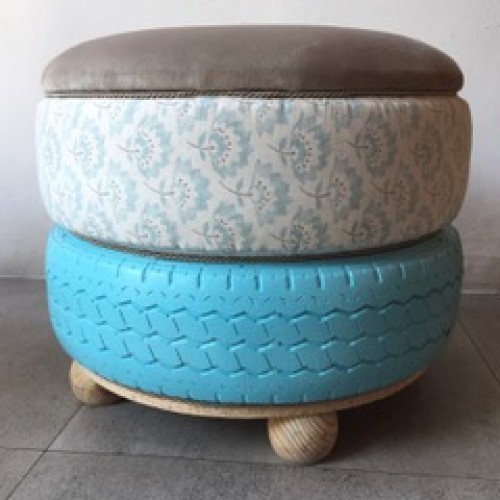 The bottom tyre is painted in a Turquoise, and the top tyre upholstered in a subtle protea print.  The top is a cushioned velvet.