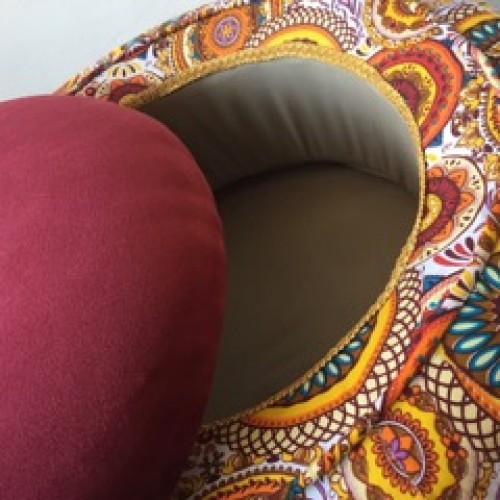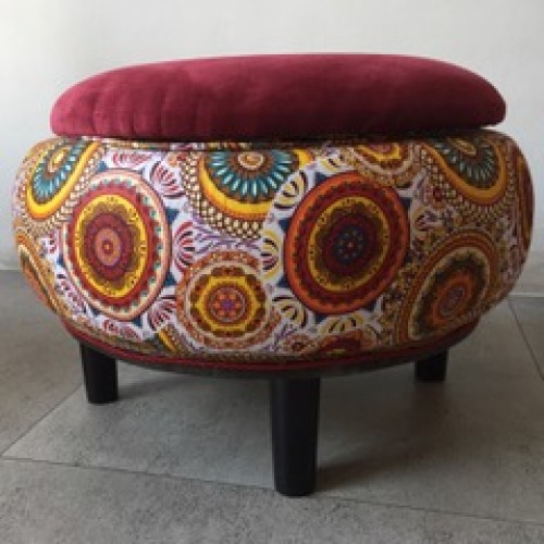This Tyre ottoman is covered with a African wax fabric, and has a cushioned, red velvet top.